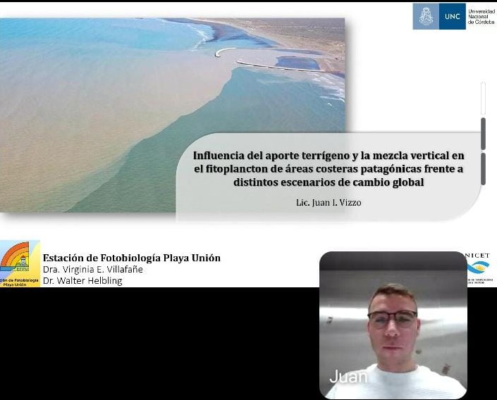 On November 27, 2025, Juan defended his doctoral thesis at the University of Córdoba (Argentina). The thesis, entitled “Influence of terrigenous input and vertical mixing on phytoplankton in Patagonian coastal areas under different global change scenarios,” was supervised by Drs. Virginia E. Villafañe and E. Walter Helbling (EFPU). This thesis was carried out within the framework of a doctoral fellowship awarded to Juan Vizzo by Consejo Nacional de Investigaciones Científicas y Técnicas (CONICET).